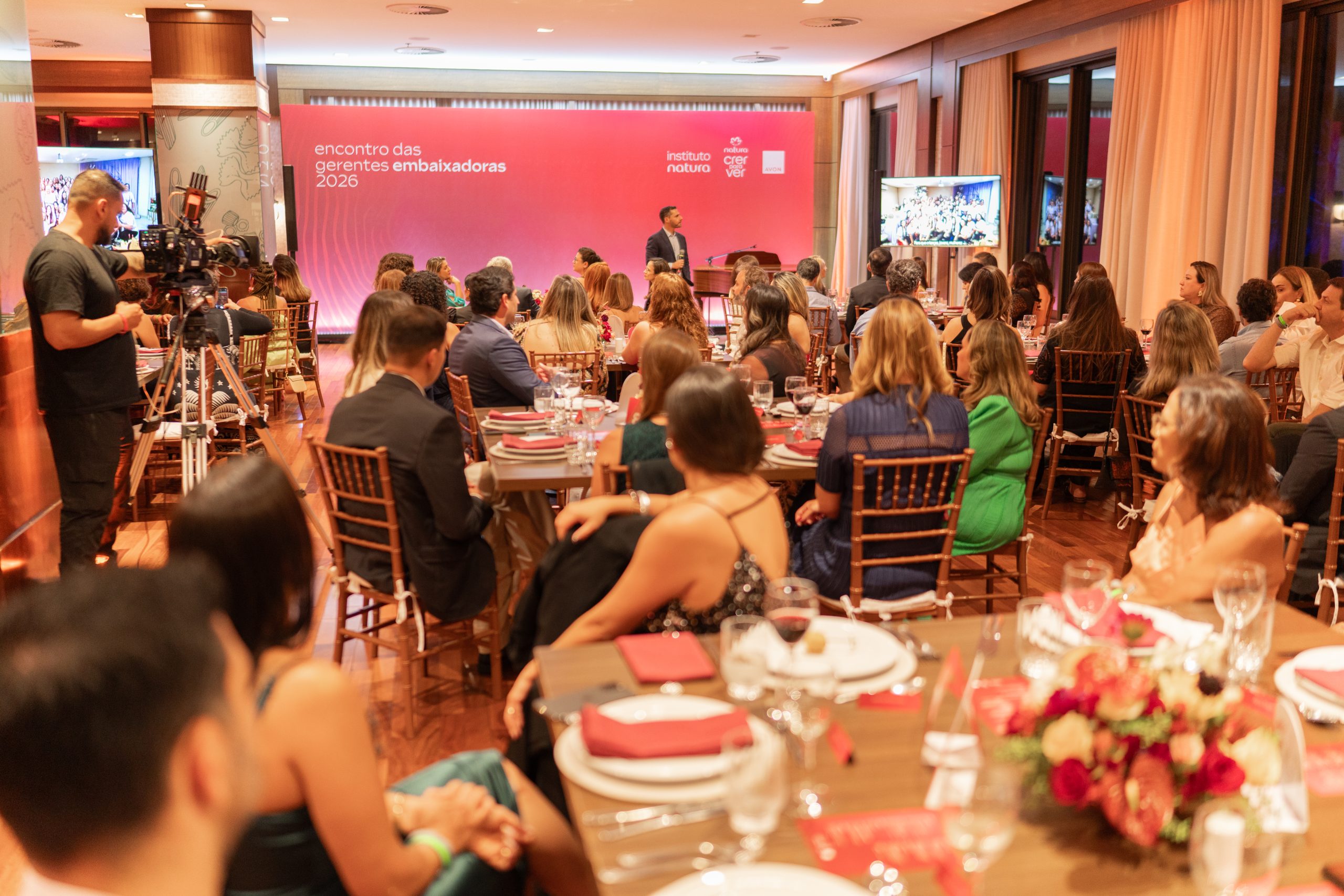 Outro momento marcante do primeiro dia foi o Jantar de Reconhecimento das Gerentes Embaixadoras 2026 promovido pelo Instituto Natura, que reuniu Gerentes Embaixadoras, lideranças da Natura, times internos, parceiros e líderes da força de vendas em um ambiente de reconhecimento e conexão, reforçando a importância do engajamento coletivo para ampliar impactos em 2026, tanto para a sociedade quanto para a própria rede.